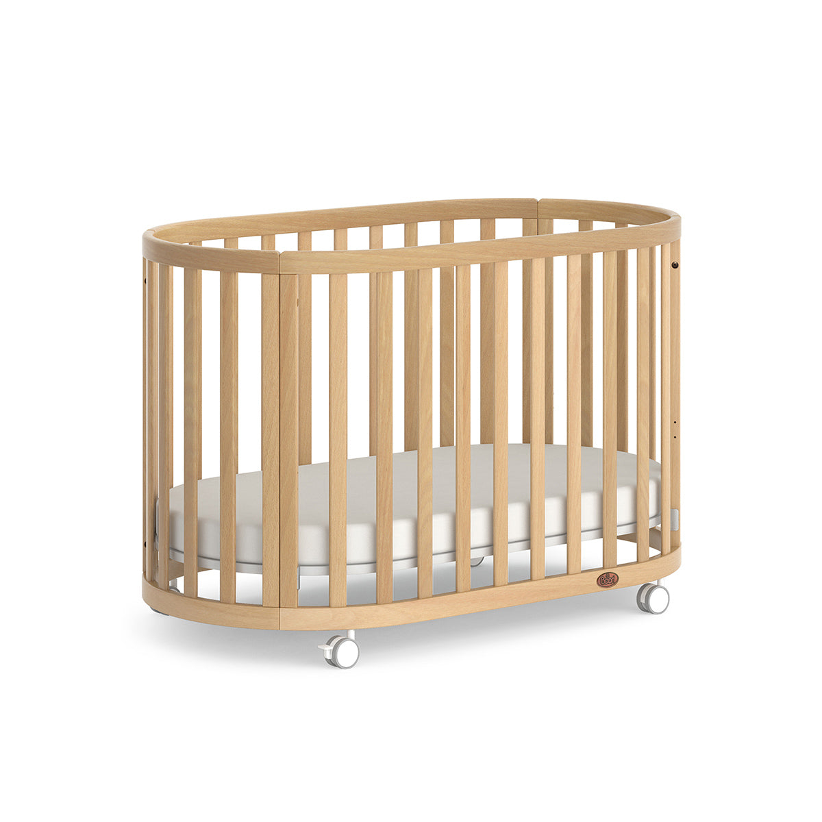 - The Eden Oval Cot features a curved design crafted with sustainable solid wood.