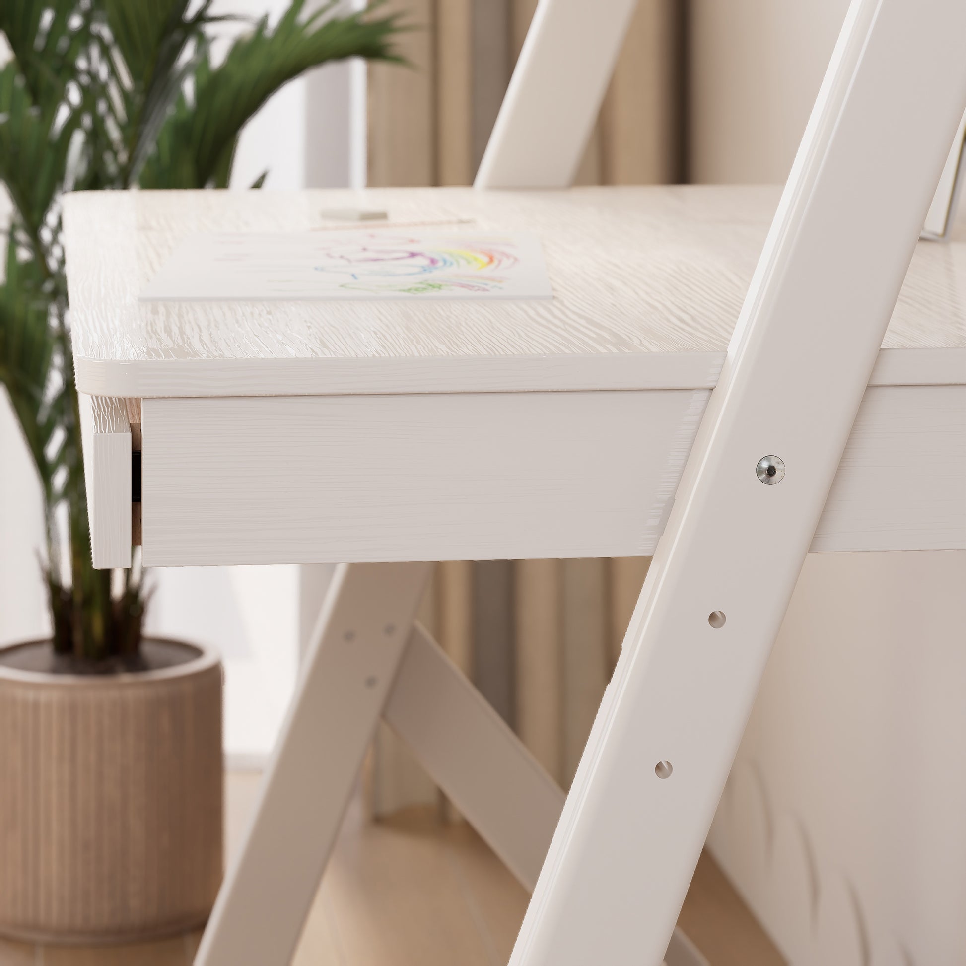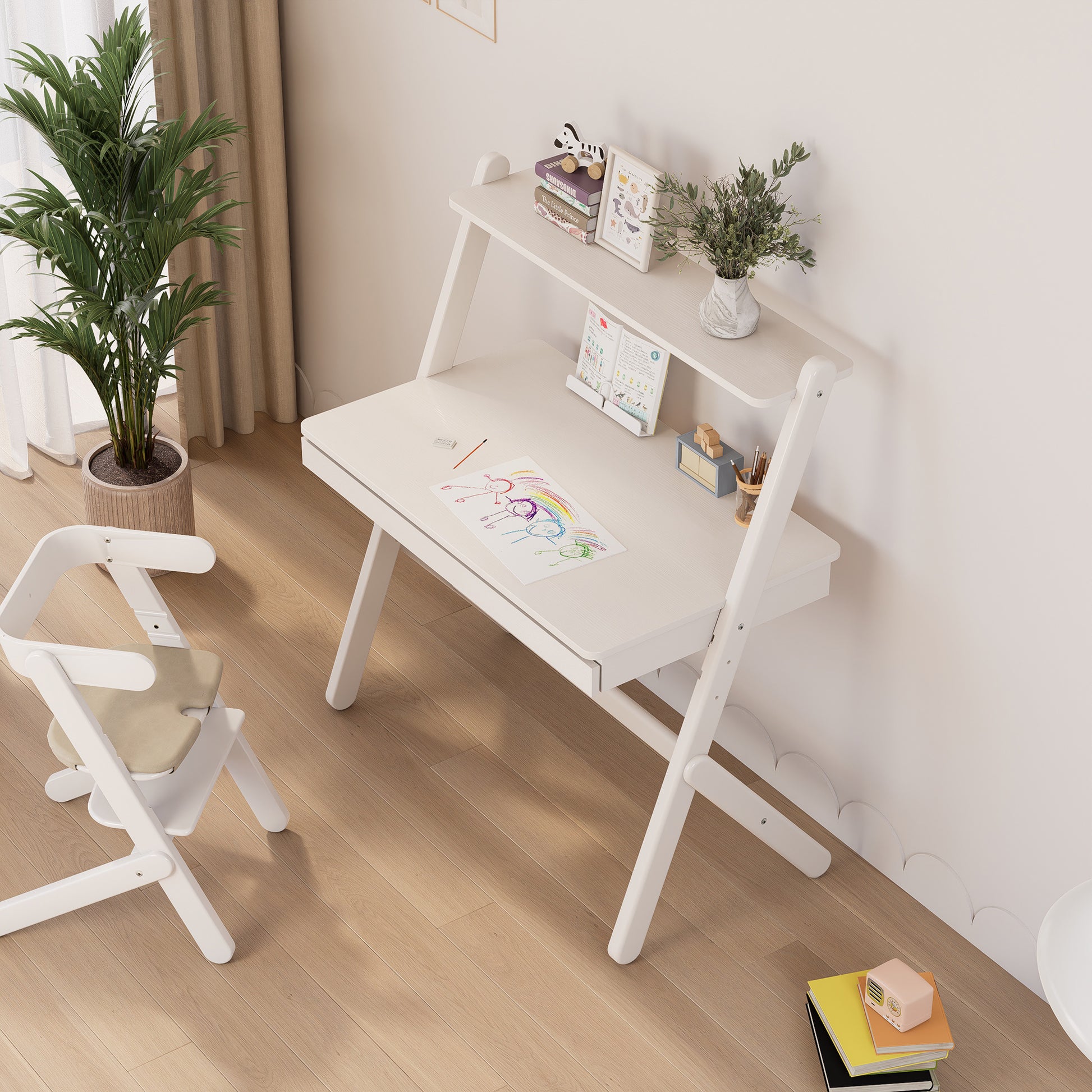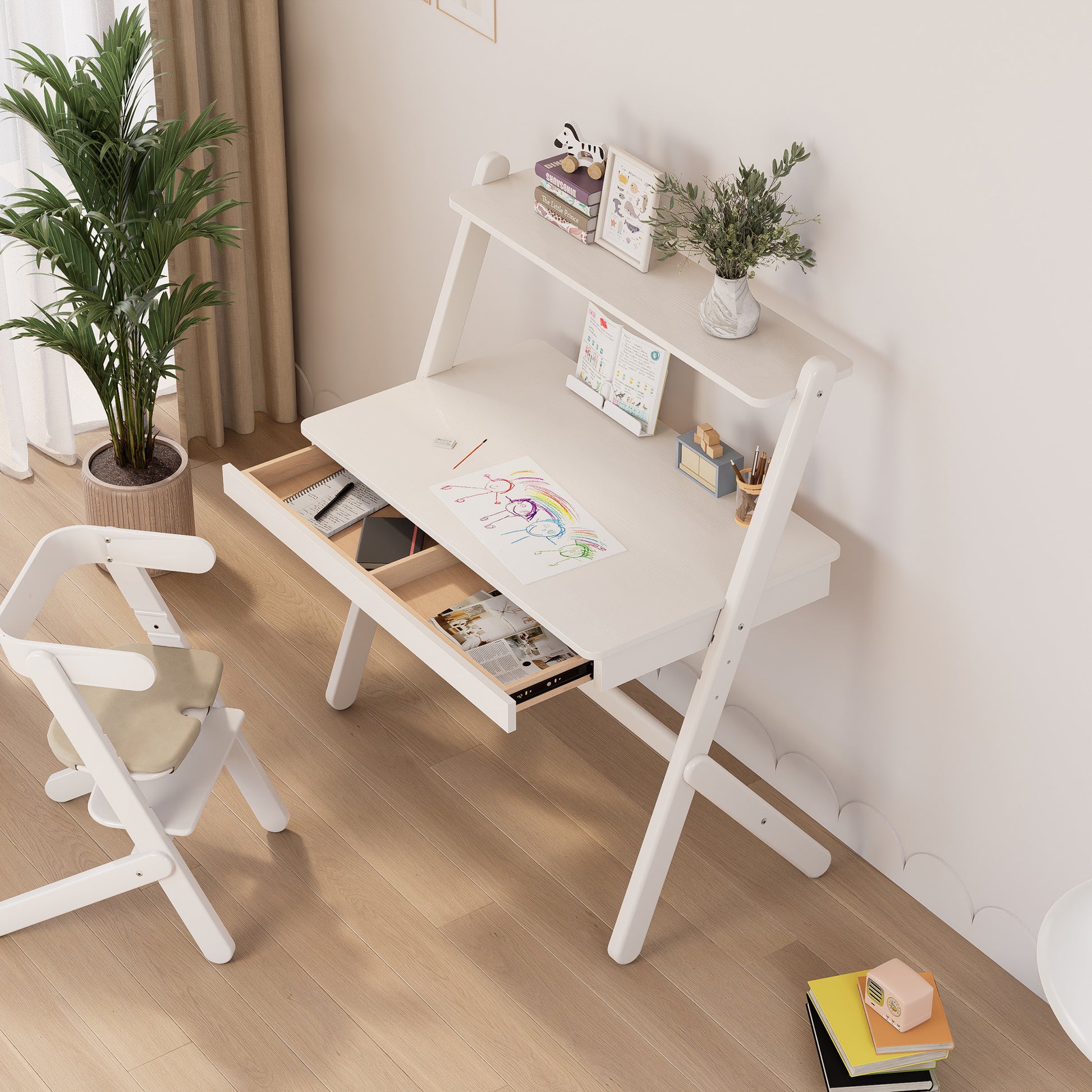The desk includes a built-in storage shelf and a slide-out drawer with two compartments to help keep essentials organised and within reach. Designed to grow with your needs, the desk can be assembled at three adjustable height levels: 61cm, 68cm, or 75cm, ensuring flexibility for users of different ages.