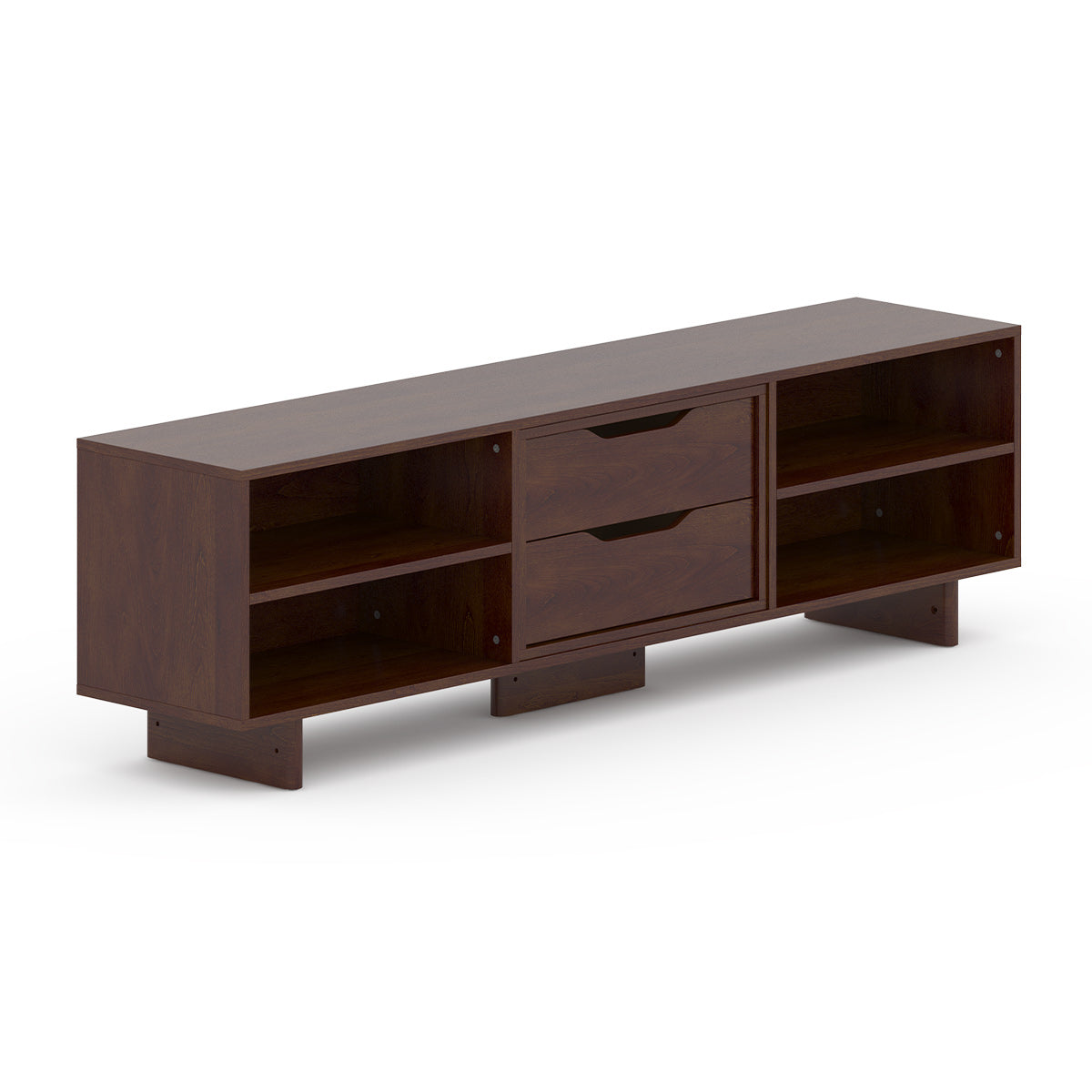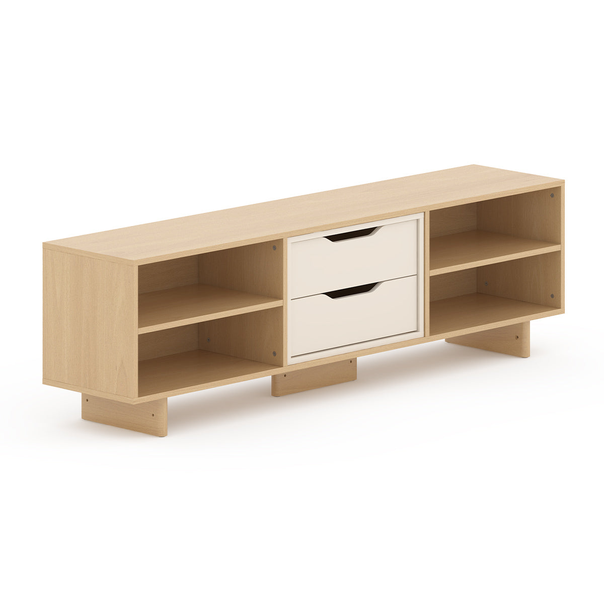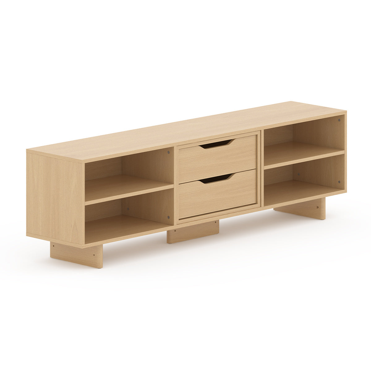 - Our entertainment unit offers a modular design, allowing better flexibility to suit different storage needs. This particular configuration comprises four shelves and two drawers. Other configurations can include a different number of storage drawers. Additionally, the feet can be assembled either laterally or vertically for a different aesthetic.