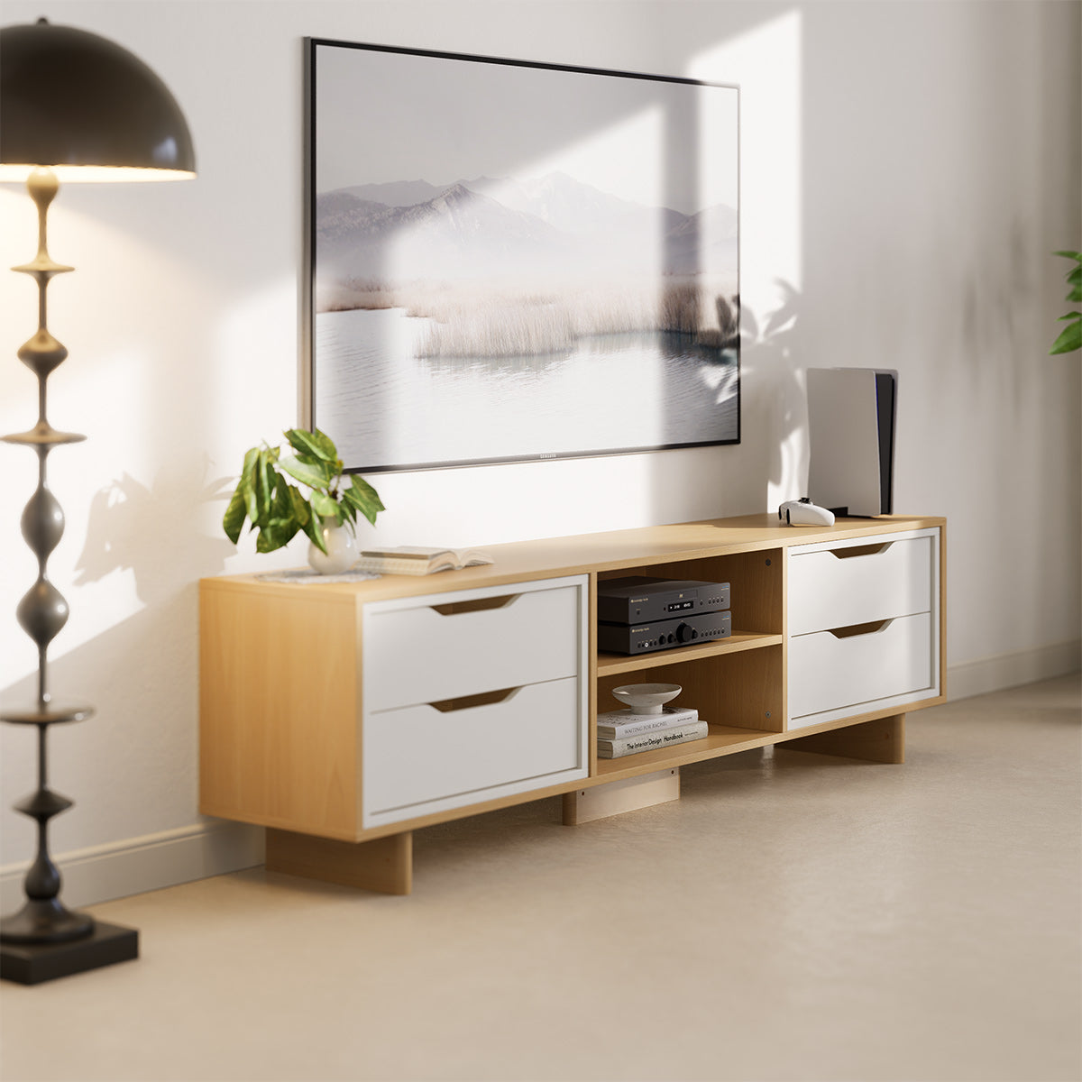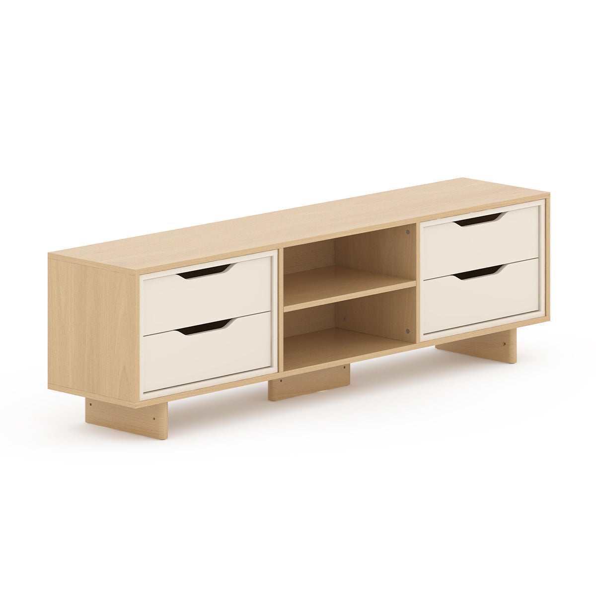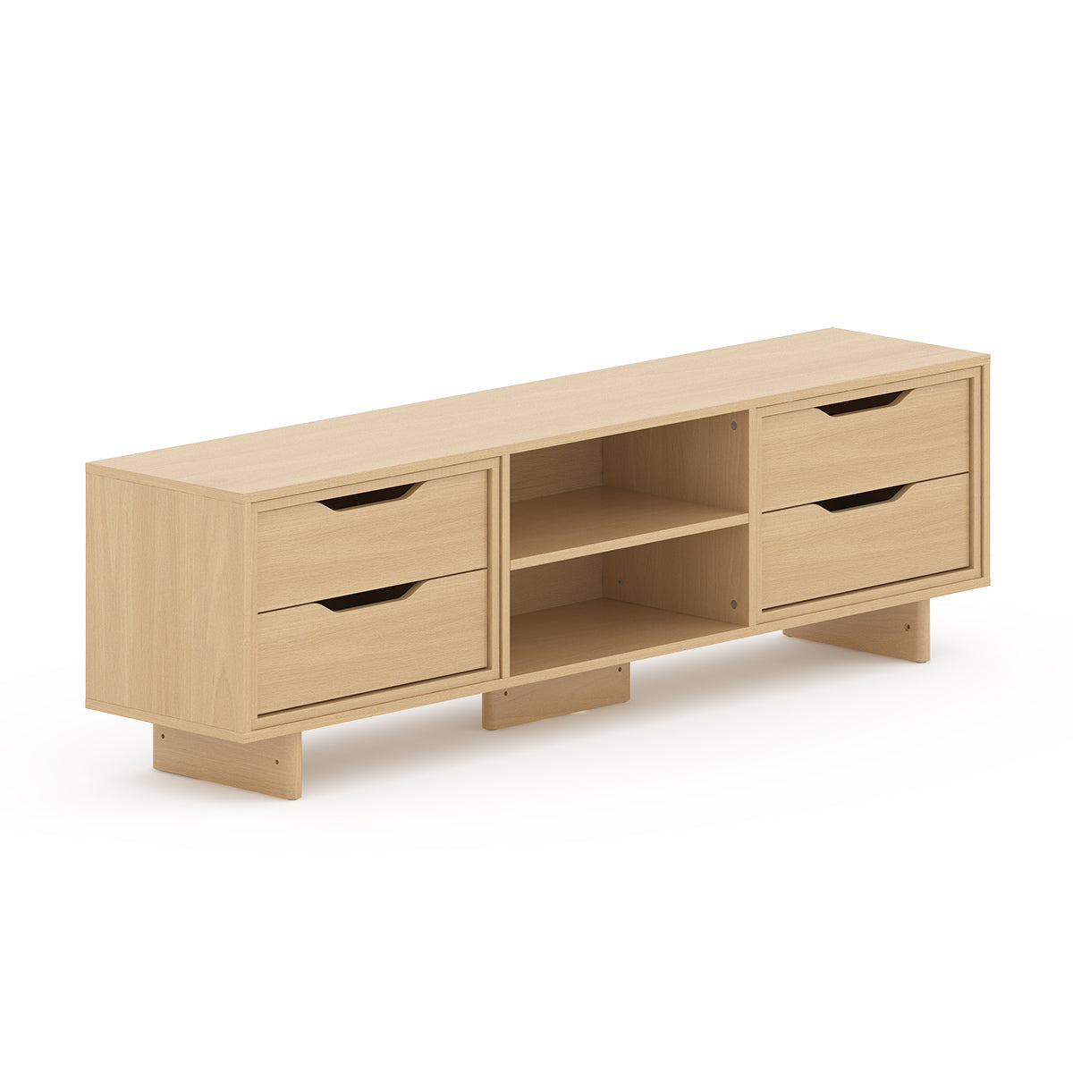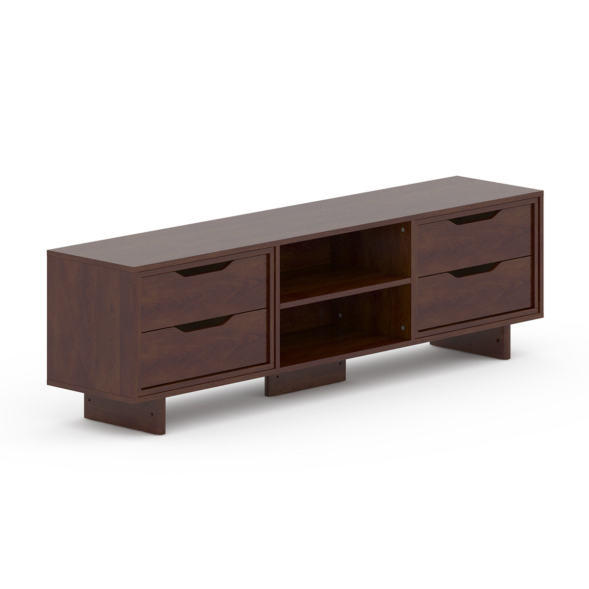 - Our entertainment unit offers a modular design, allowing better flexibility to suit different storage needs. This particular configuration comprises two shelves and four drawers. Other configurations can include the addition of storage drawers. Additionally, the feet can be assembled either laterally or vertically for a different aesthetic.