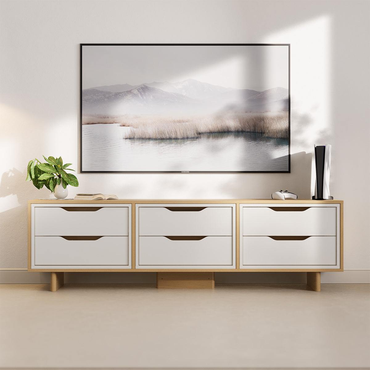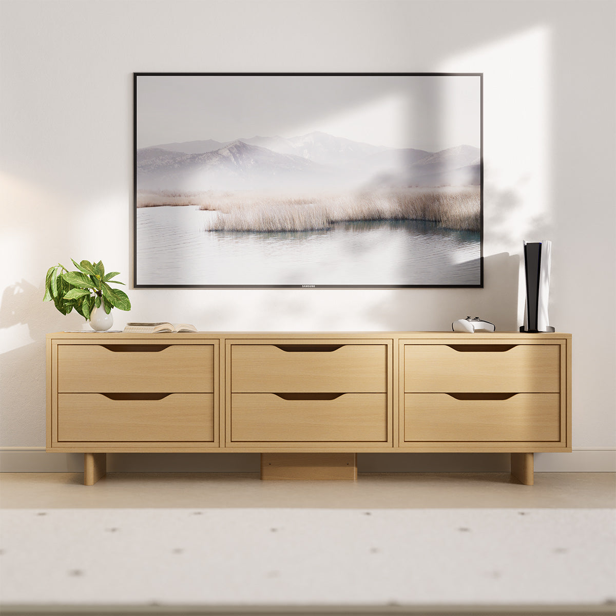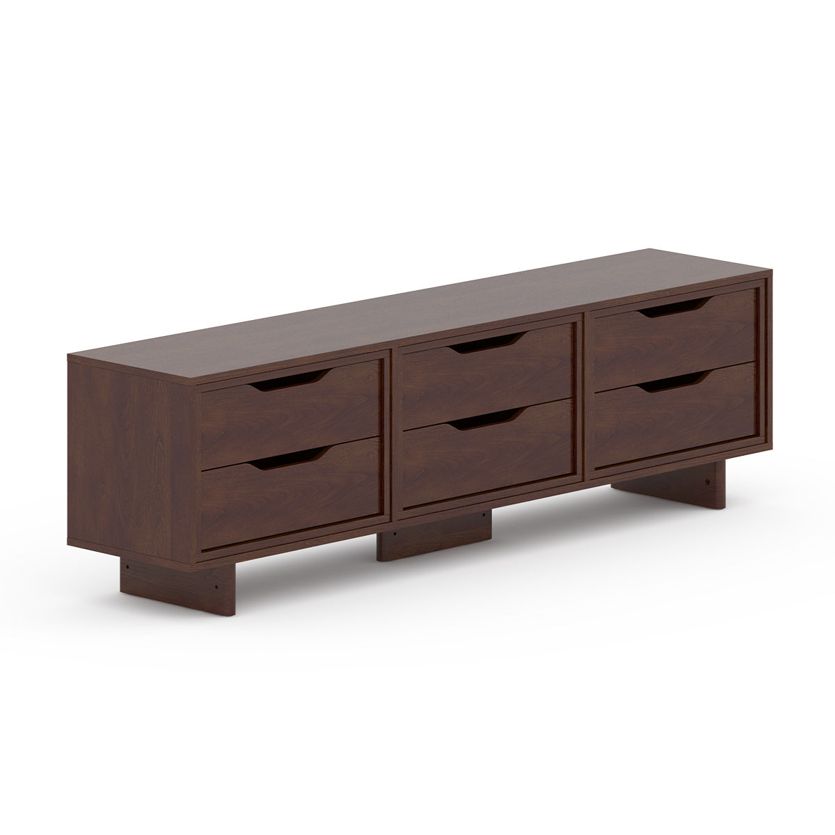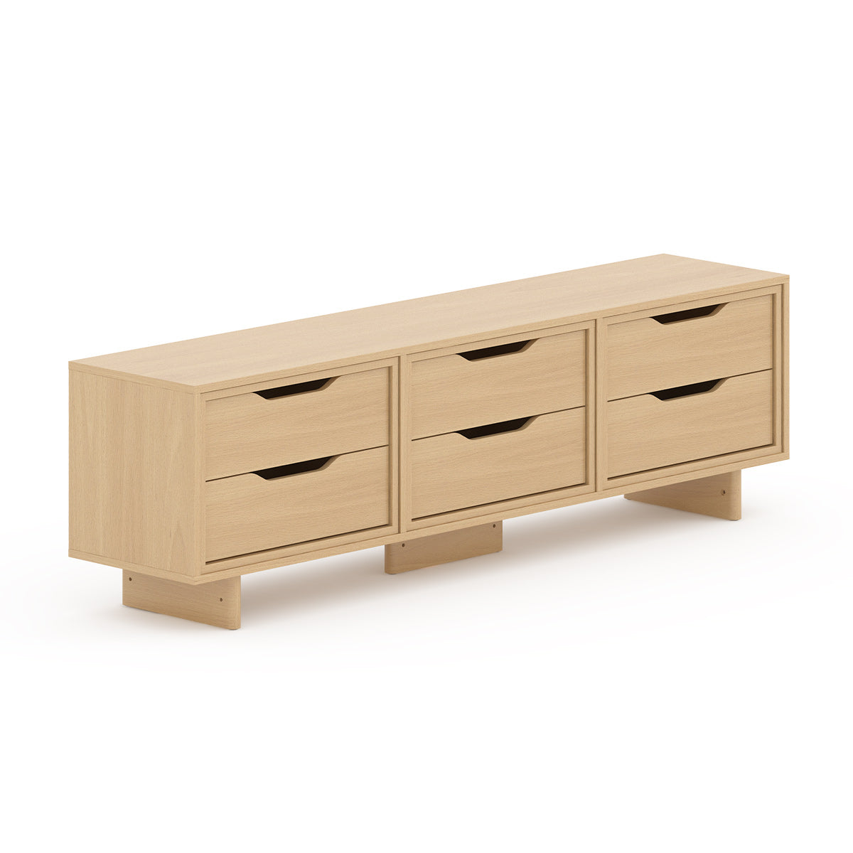 - Our entertainment unit offers a modular design, allowing better flexibility to suit different storage needs. This particular configuration comprises six drawers. Other configurations can include the addition of storage drawers. Additionally, the feet can be assembled either laterally or vertically for a different aesthetic.