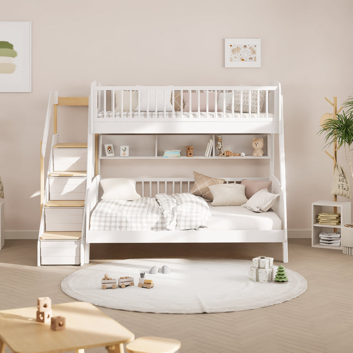 - Triple sleeper bunk bed with storage staircase. Timeless design includes rounded edges for kid-friendly safety and classic spindles for a charming aesthetic.