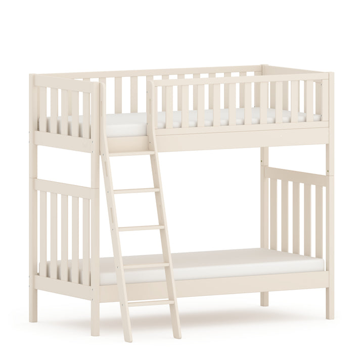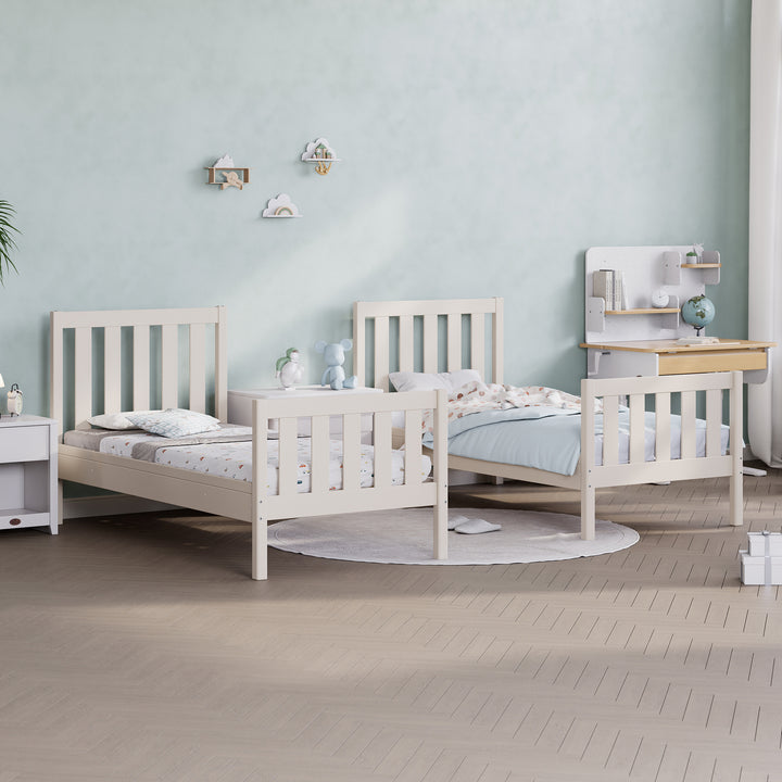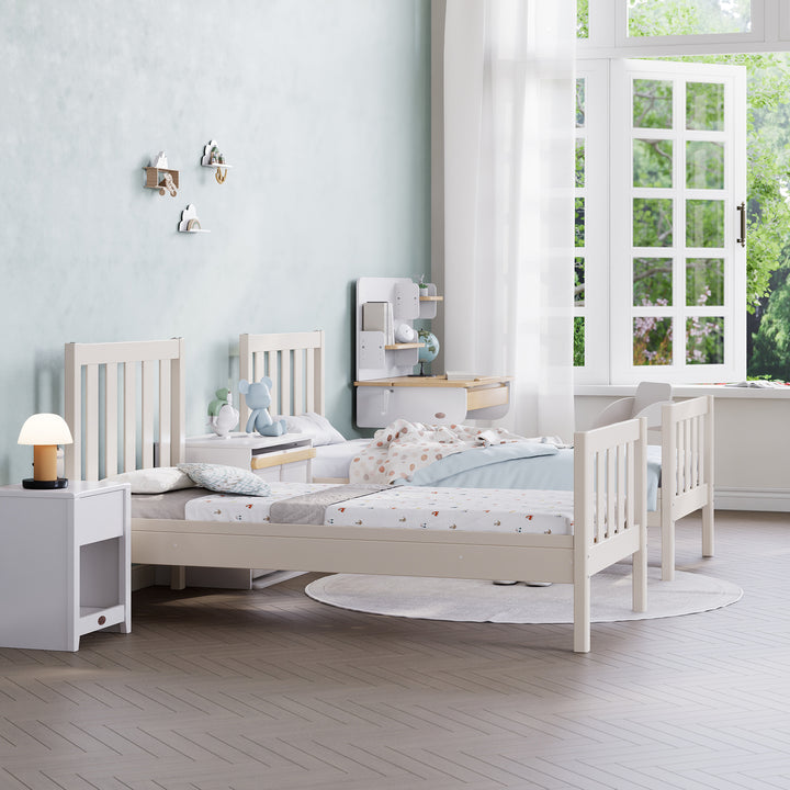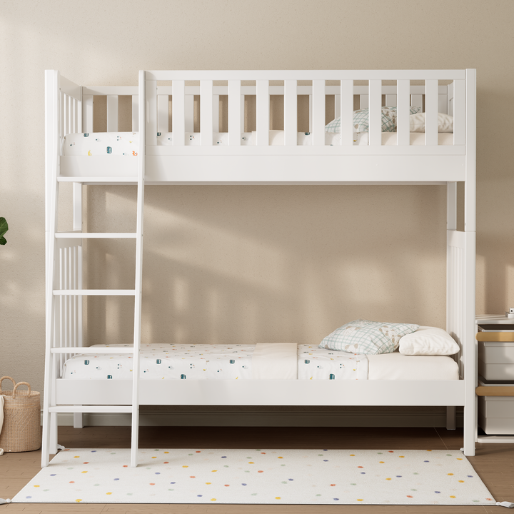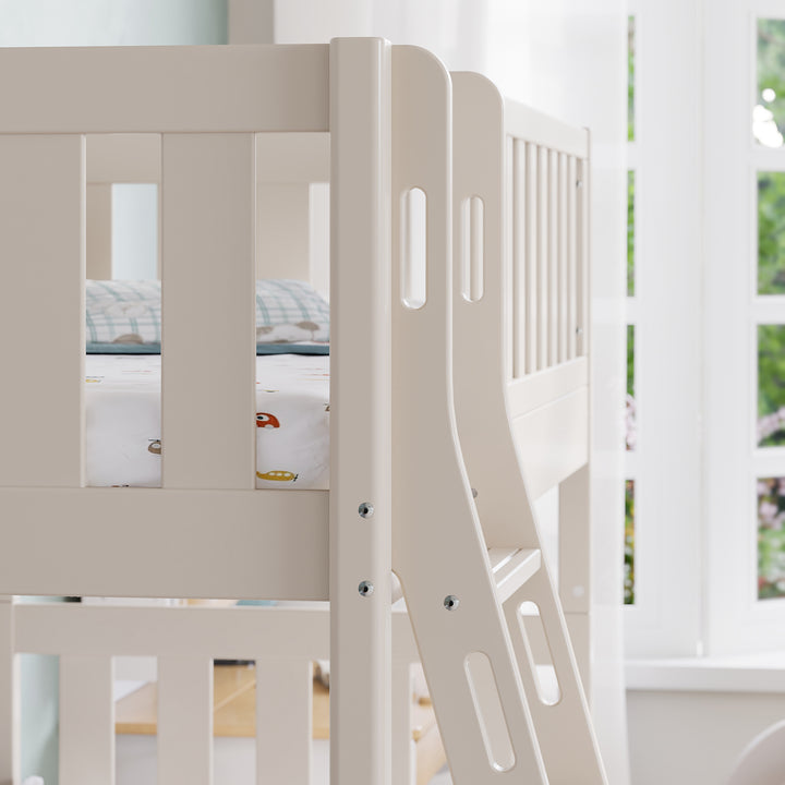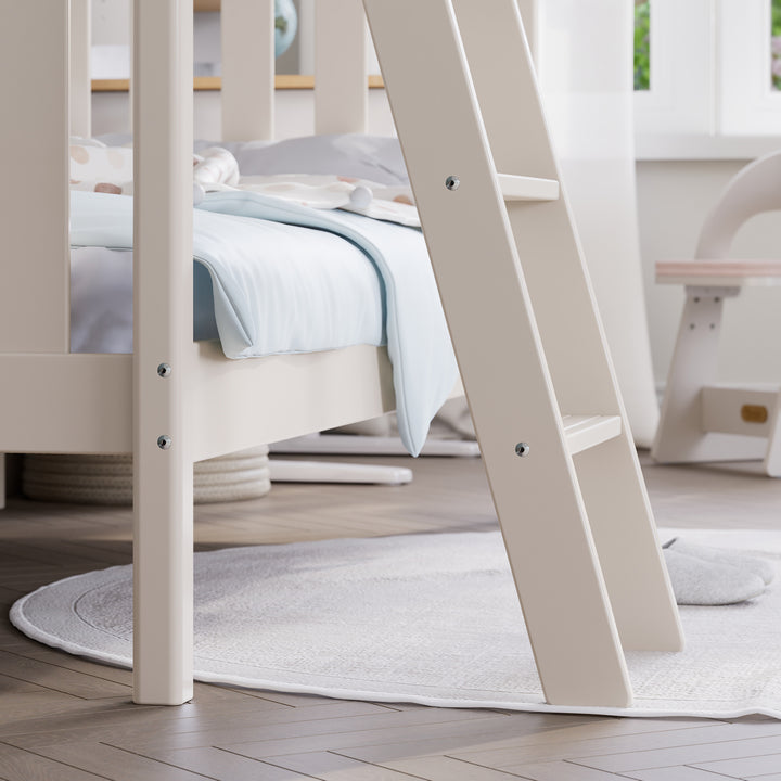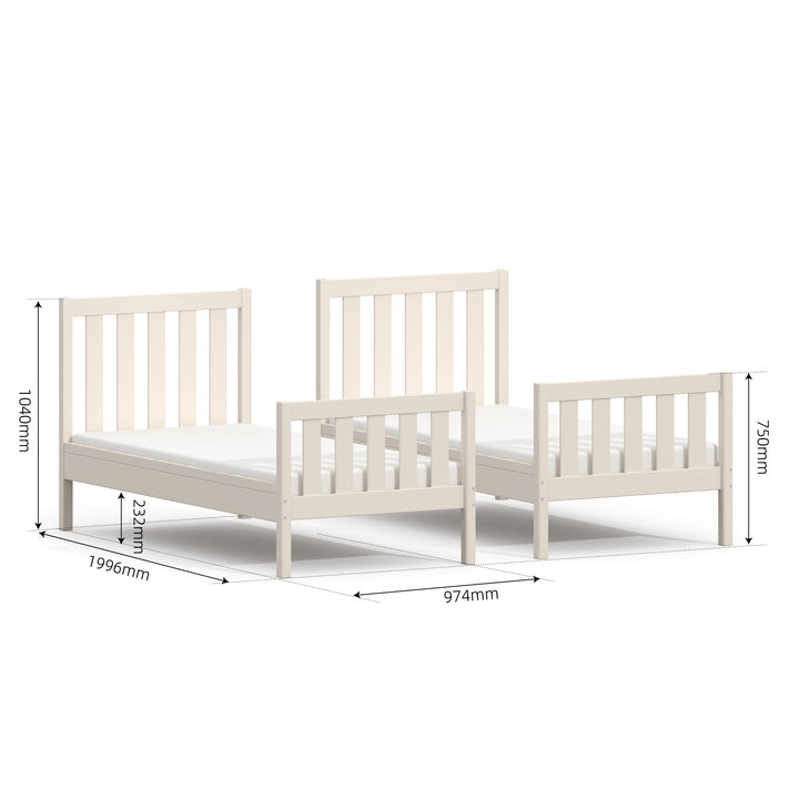The Oslo Single Bunk Bed offers a traditional yet timeless design, perfect for growing families or shared bedrooms. With a frame crafted from solid timber and finished in a warmer hued soft white, it combines durability with a classic aesthetic that suits a range of interior styles.