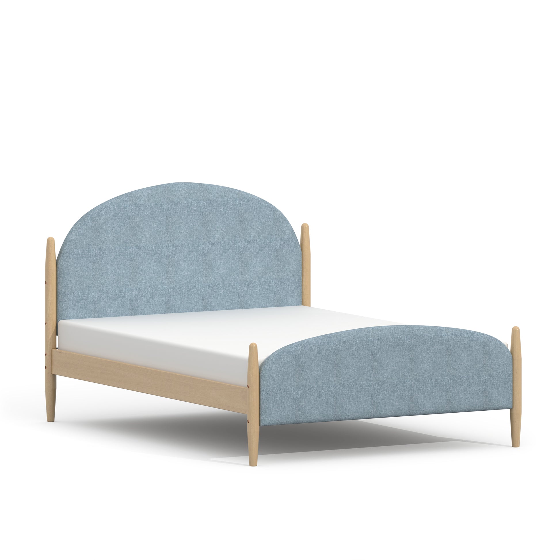 - Durable plywood and Beech wood timber bed in a playful yet minimalist contemporary style, featuring an arched fabric covered bed headboard and rounded spindle corners.