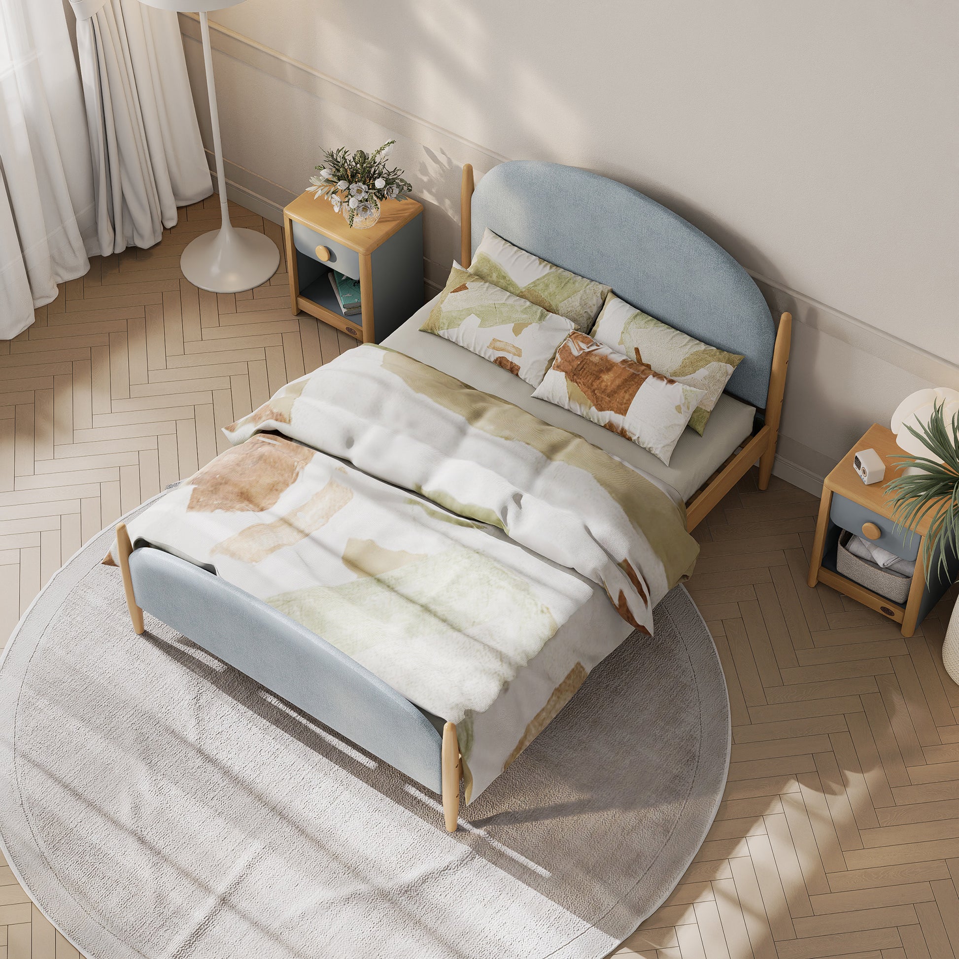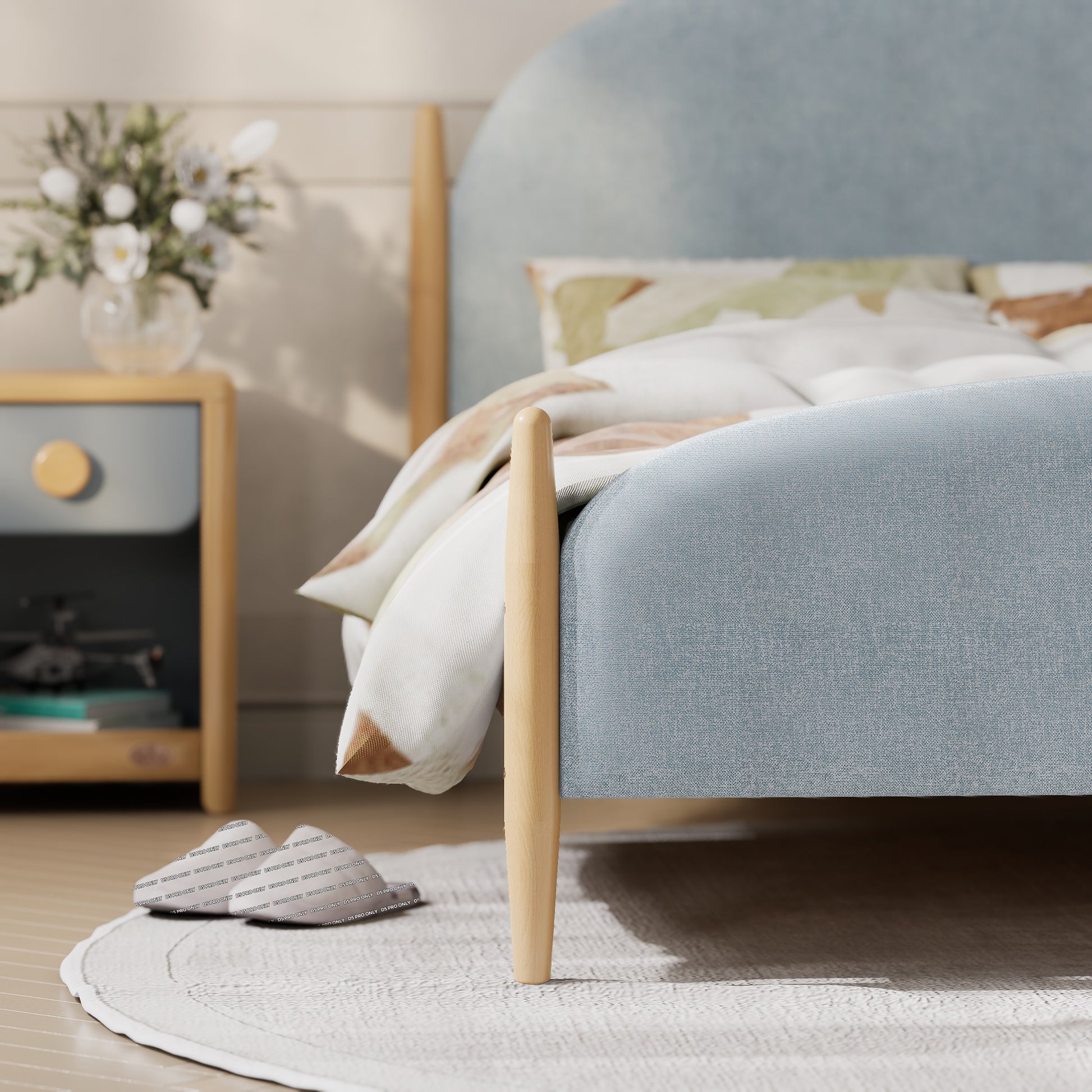 Its standout feature is the gracefully rounded headboard and footboard with an upholstered fabric cover, exuding a sense of warmth, making it the perfect addition to any bedroom. The bed frame's rounded spindle bed corners add an enchanting touch to its overall appearance, contributing to its classic charm.